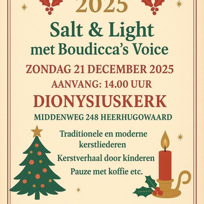 Kerstconcert 2025 Salt & Light met Boudicca's Voice, aanvang 14.00 uur, Dionysiuskerk, Middenweg 248, 1701 GH Heerhugowaard, traditionele en moderne kerstliederen, kerstverhaal door kinderen, pauze met koffie/thee, enz., iedereen is van harte welkom om samen de kersttijd in te luiden! Deurcollecte na afloop