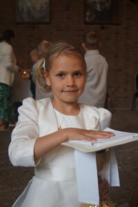 Een puntje van aandacht: het zou heel goed en fijn zijn als communicantjes en ouders al vóór het grote feest van de Eerste heilige Communie op zondag naar de kerk gaan. Kinderen/gezinnen moeten zich ‘thuis’ gaan voelen in de kerk. De kerk is het huis van God, bij God ‘thuis zijn’ is belangrijk. We horen veel over jonge mensen, die zich niet thuis voelen in het leven, het leven niet zien zitten. God ‘kennen’ geeft houvast, vreugde, inhoud! Elke zondag tijdens de heilige Mis (10.00 uur) is er KinderWoordDienst voor de basisschoolleeftijd: het evangelie van de zondag wordt dan, in een aparte ruimte, besproken op leeftijdsniveau. Voor tieners is er TienerWoordDienst, een hoger niveau (en tegenwoordig is er ook een PeuterWoordDienst). Zo kan de kerk, het huis van God, een thuis worden voor kinderen én ouders. Dat is Gods bedoeling: op zondag ‘gewoon’ naar de kerk gaan: vieren dat Hij uitnodigt en van ons houdt.